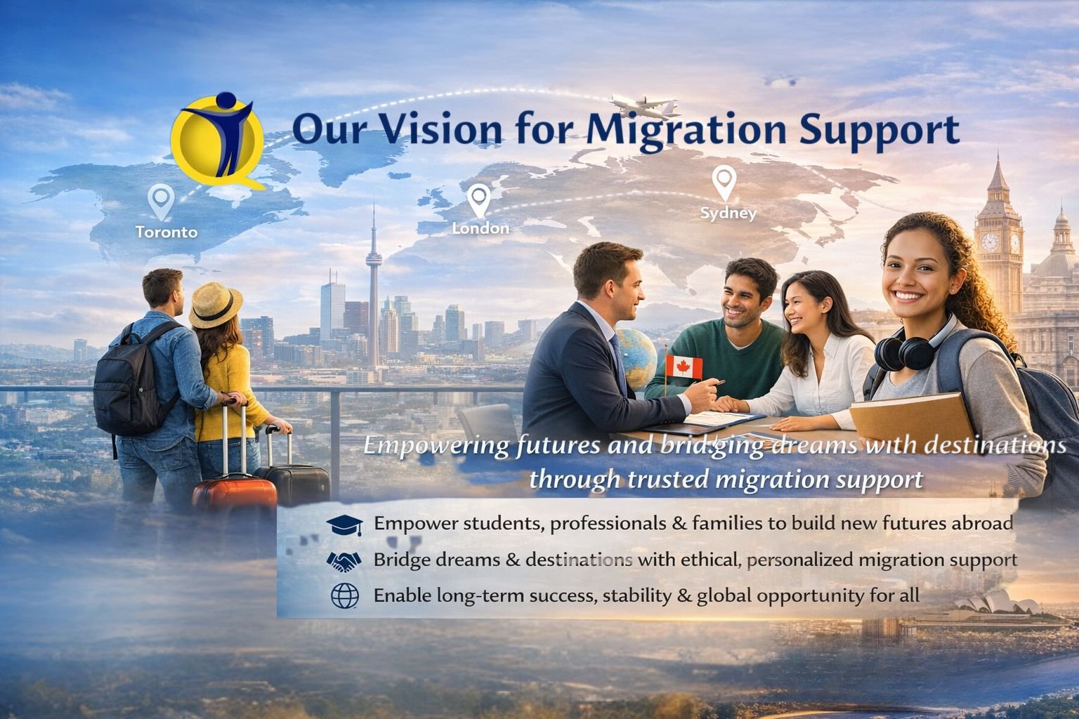 Our vision is to become a trusted and ethical migration support platform that empowers individuals and families to confidently build a new future abroad. We aim to simplify the migration journey through transparent guidance, accurate information, and personalized support.